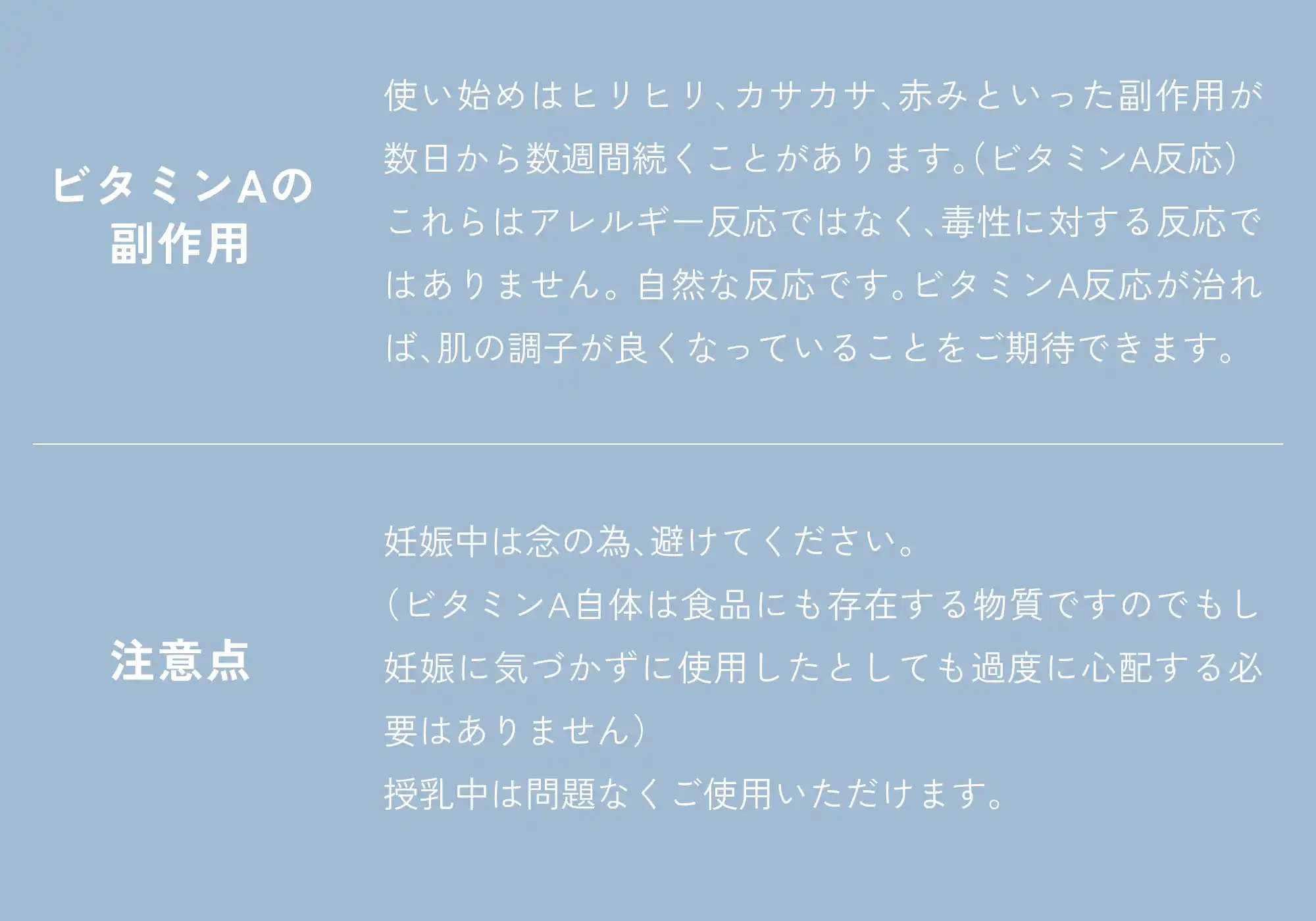 皮むけ等のビタミンA反応が起こる場合がございます。